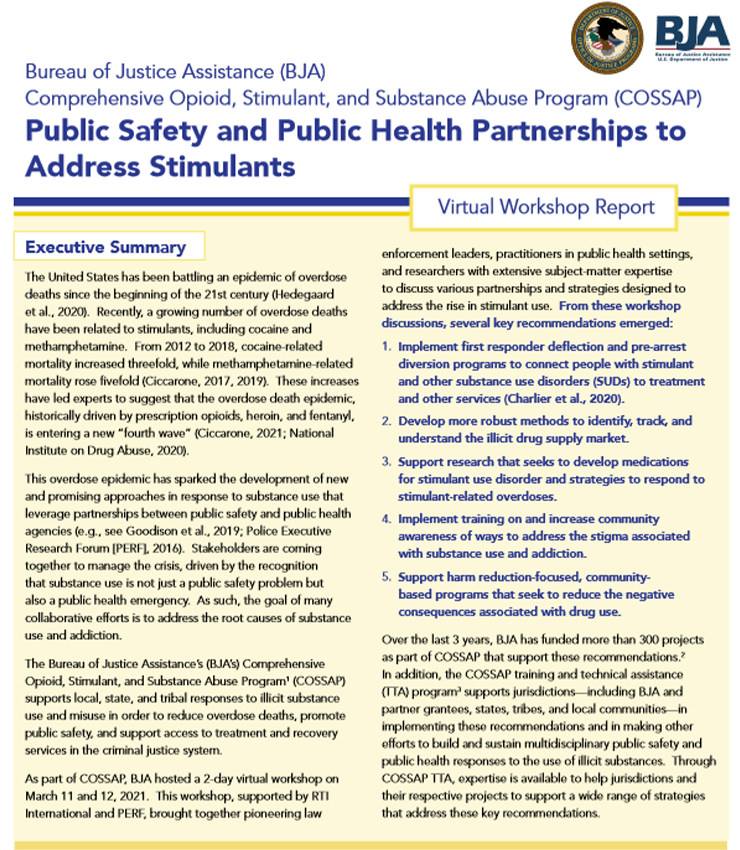 As part of COSSAP, BJA hosted a 2-day virtual workshop on March 11 and 12, 2021. This workshop, supported by RTI International and PERF, brought together pioneering law enforcement leaders, practitioners in public health settings, and researchers with extensive subject-matter expertise to discuss various partnerships and strategies designed to address the rise in stimulant use.